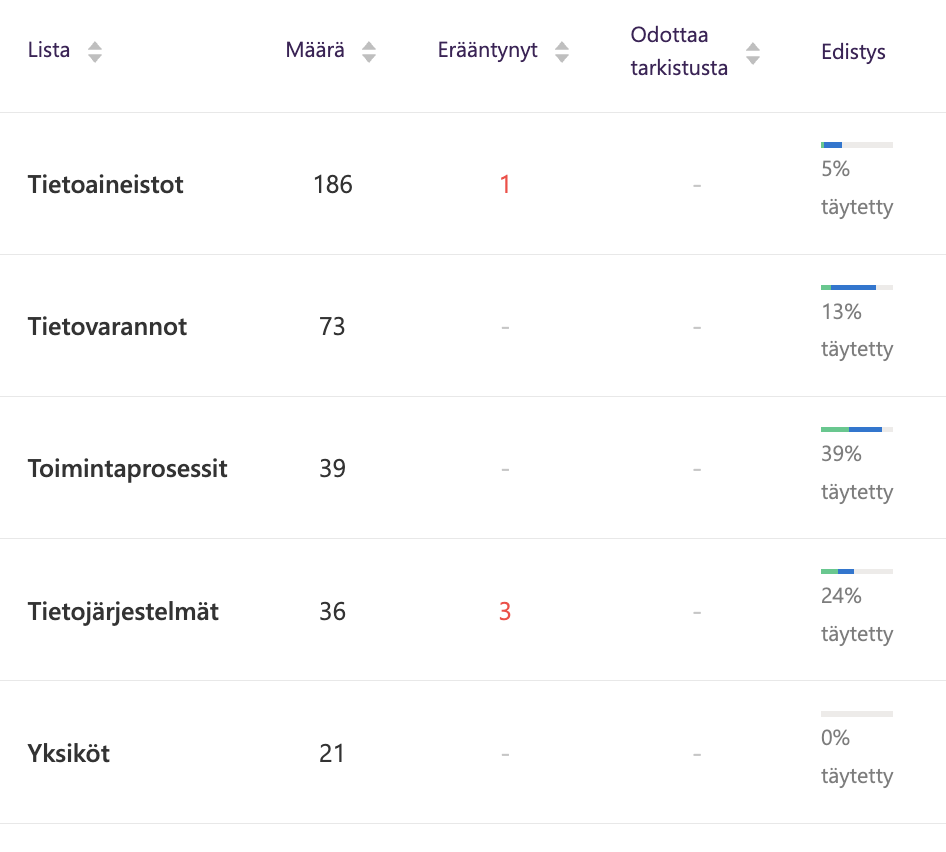 Jokaisella dokumentoitavalla kohteella on oma taulukkonäkymänsä, jossa on valmiit saraketiedot ja välilehdet. Saat yleiskuvan vain katsomalla solujen värejä ja edistymispalkkeja - vihreä tarkoittaa, että kohta on tehty valmiiksi!