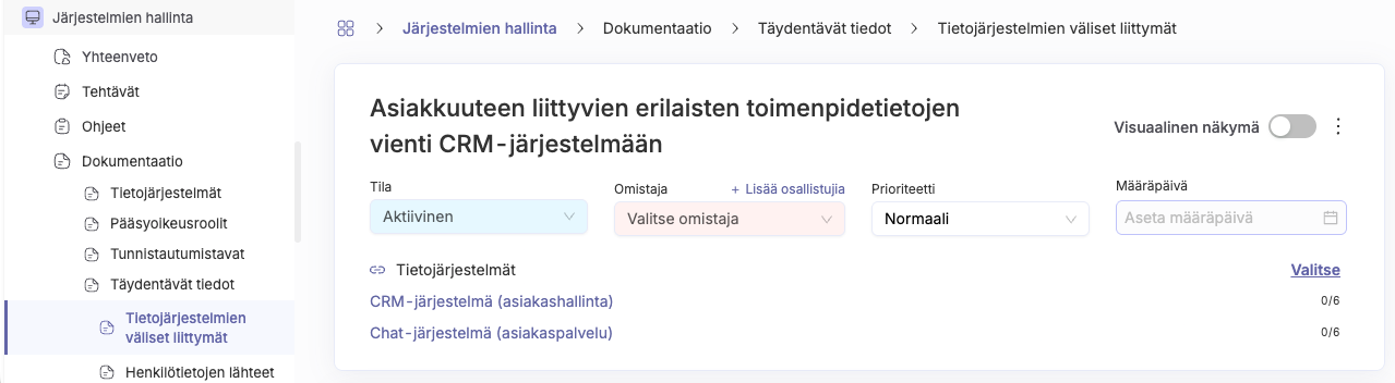 Liittymät keskittyvät tiedonkulkuun järjestelmien välillä: mitä tietoa siirretään, mihin suuntaan ja millä teknisellä tavalla. Ne täydentävät kokonaiskuvaa tietojärjestelmäympäristöstä tuomalla näkyviin järjestelmien väliset yhteydet ja riippuvuudet osana organisaation tiedonhallintaa.